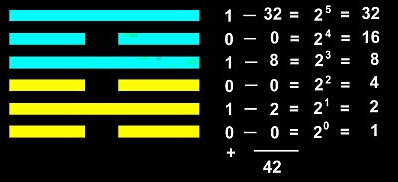 En este sistema de representación, si asignamos, como ya lo hizo Leibniz, a la raya continua el valor uno y a la raya partida el valor cero, comprobamos que éste hexagrama, Wei Chi, reproduce al número 42 en cifras binarias.