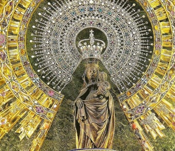 Existen elementos iconográficos paralelos entre la Virgen María, que no deja de ser la misma que trajo el Pilar a este lugar, y la diosa Guan Yin china, pues las dos son la referencia de la Diosa del Amor, que comprenden los sentimientos de temor y responden a las peticiones de ayuda con su Compasión. La Virgen del Pilar, aparece en el interior de la Basílica como una talla de marfil, también con un niño en los bazos, portando una bola y un rosario de cuentas.