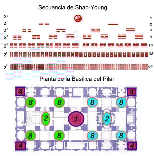 Como veremos en el siguiente esquema, volviendo al hexagrama Wei Chi, vemos que éste está formado por seis líneas, alternativamente continuas y discontinuas que corresponden al lenguaje informático binario de seis «bit». De tal modo que la Basílica del Pilar sería el primer templo occidental que utilizaría las cifras del lenguaje informático para representar ideas y símbolos abstractos.